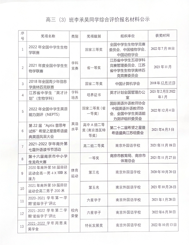 3.经本人申请,现将综合评价获奖情况申报材料公示如下: